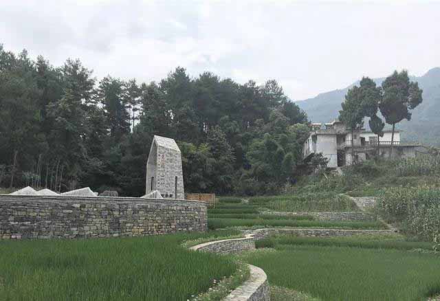 鳳凰措,位于山東日照。采用山的意向,由兩個當地石材砌筑的雕塑體構成,與遠處的山體相互呼應。
